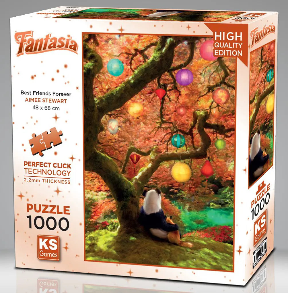 This Fantasia jigsaw puzzle features “Best Friends Forever” by Aimee Stewart, showing two pandas sharing a gentle moment under a lantern-lit tree in autumn’s glow. With 1000 pieces made from sturdy 2.2 mm cardboard, a matte, non-glare finish, and Perfect Click Technology, each piece snaps together smoothly and stays in place. When complete, the puzzle measures 68 × 48 cm. Perfect for ages 12 and up, it offers a relaxing challenge and creates a heartwarming scene ready to frame.