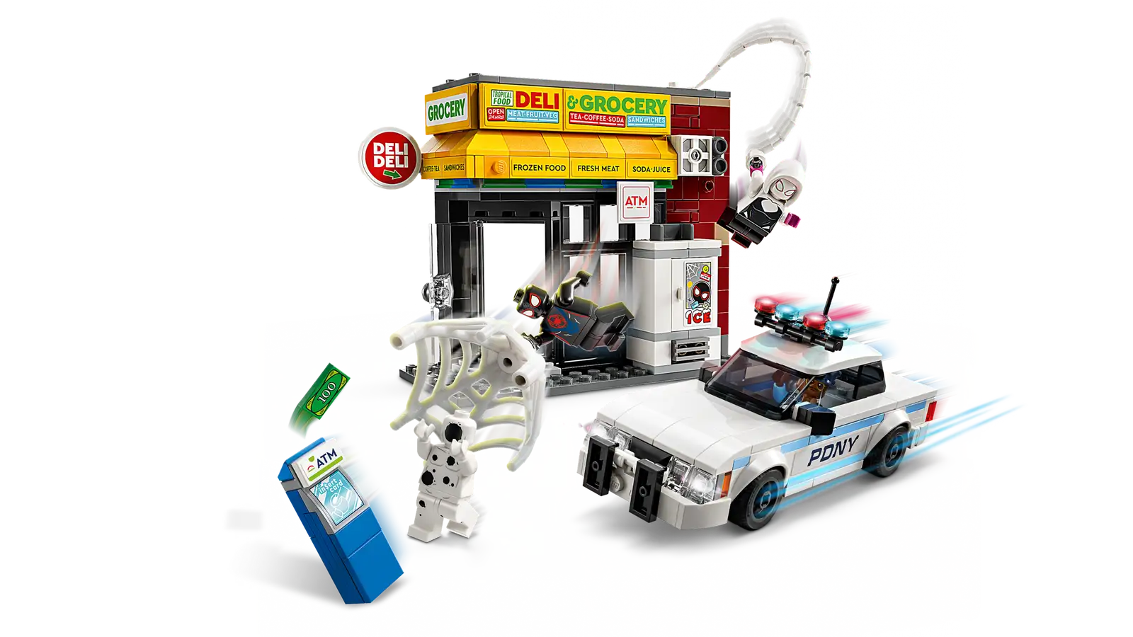 The Spider-Man playset comes with 4 minifigures: Miles Morales, The Spot, Gwen Stacy and Officer Jefferson. The convenience store has an exploding-wall feature that allows the ATM to be removed. Accessories include a long, flexible web rope and a flexible web that is large enough to encase a minifigure. The police car opens to allow 2 minifigures to be placed inside. For added digital fun, builders can zoom in, rotate models in 3D and track their progress using the fun, intuitive LEGO Builder app.