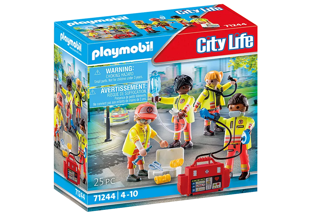Join the PLAYMOBIL Medical Team and become an everyday hero. The four-person team is not only highly trained, but also ideally equipped for all emergencies. In the event of a heart attack, the paramedics have their modern defibrillator bag with them. With the defibrillator, patients can be helped quickly. The defibrillator bag and doctor's case provide space for other medical accessories such as scissors, tweezers and splint dressings. The silicone splint bandages fit flexibly. Grab your stethoscope and get ready for action!
