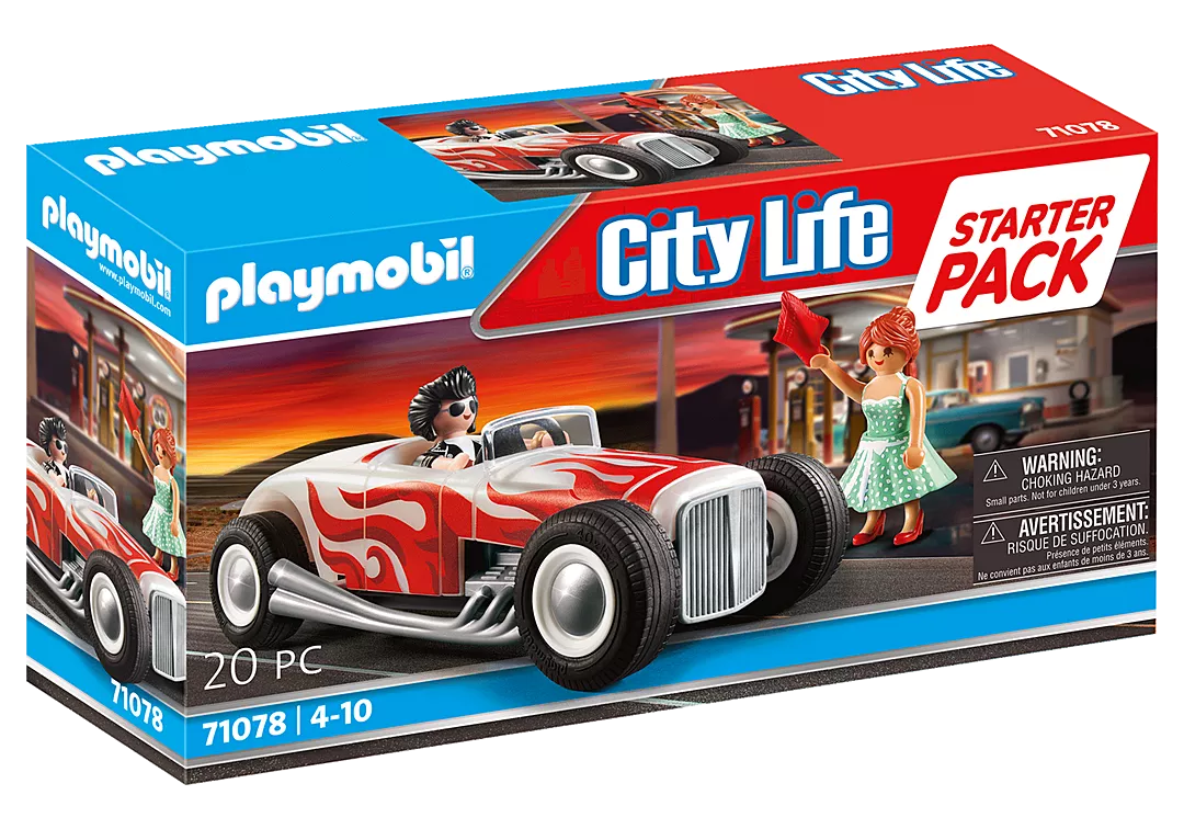 The perfect introduction to the PLAYMOBIL play worlds! Welcome to the 50's! Take to the track with the cool hot rod.