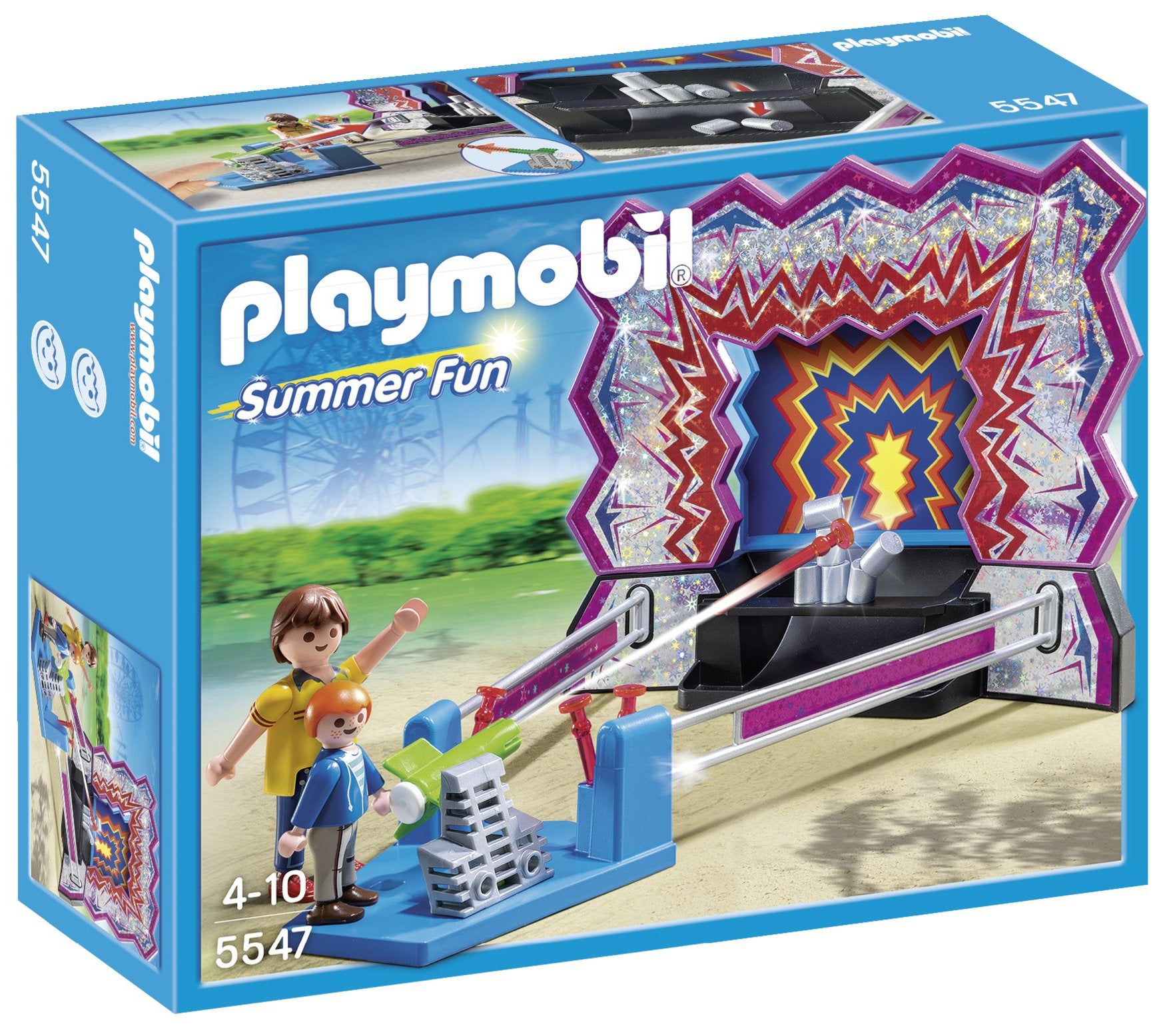 - The PLAYMOBIL Tin Can Shooting Game is one of the favourites among the excited funfair goers. With it's attractive, colourful background and cheerful game attendant this ride tempts all the passers by to give it a try! There are four darts to try your luck, can you knock all six cans down to win the prize? The set comes complete with 1 PLAYMOBIL game attendant, a young child and lots of accessories